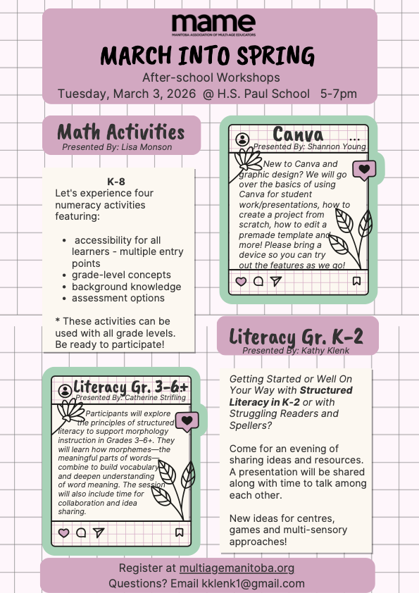 Our mission as the Manitoba Association Of Multi-age educators is to provide opportunities that encourage and strengthen leadership, collaboration, and professional development. We believe in empowering educators to foster inclusive and engaging, multi-age, learning environments that challenge and support every student. We strive to promote effective networking and collaboration amongst members by facilitating and providing access to relevant professional development. MAME is committed to supporting its members in their journey as educators.
