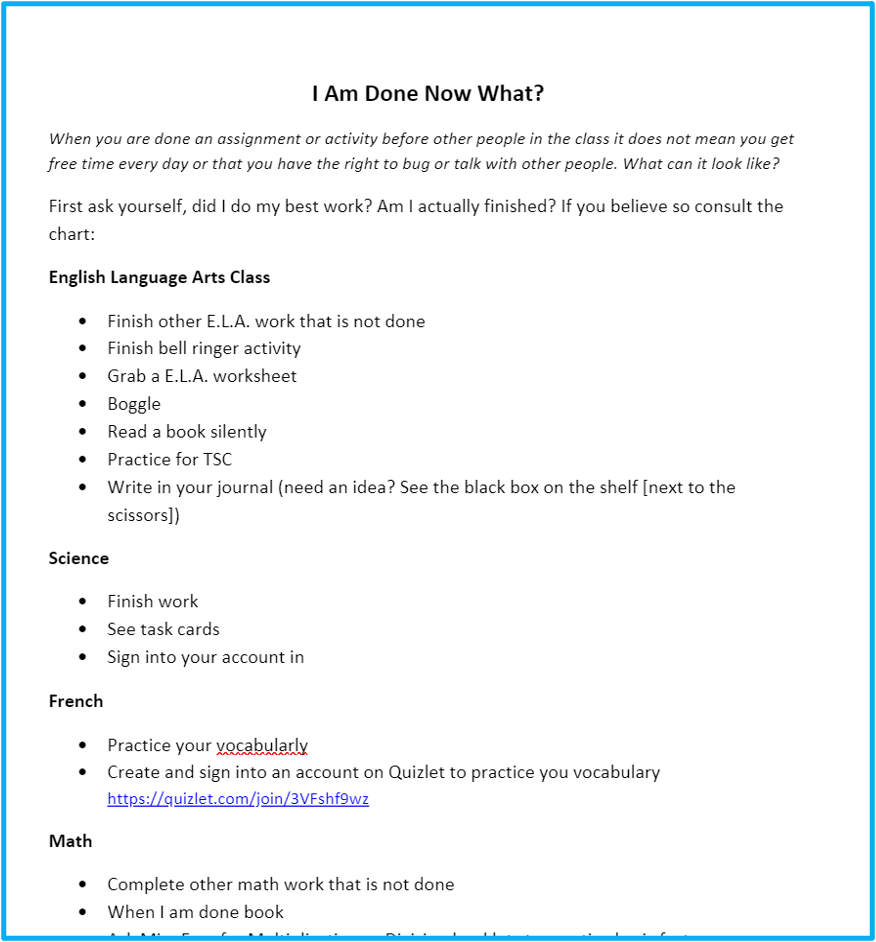 This author, as a middle school teacher, personally prefers to ensure students are continuing to practice or grow a skill set based on the subject they are working in. If they finish science first, I always try to encourage a science activity first, such as practicing vocabulary set on Quizlet or finishing outstanding homework. If it is math, I try to always ensure there are either online practice websites available that match the current concept, games that could be independent or in small groups, the problem of the week, or finally a variety of easy math puzzles they can have fun attempting.